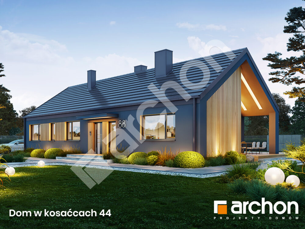 Interesująca propozycja dla Inwestorów poszukujących projektu wygodnego domu parterowego o powierzchni ok. 110 m2 o prostej, regularnej bryle zwieńczonej dachem czterospadowym. Elewacja z jasnego tynku, uzupełniona o drewniane akcenty i ciemne detale, wpisuje się w aktualne trendy architektoniczne i tworzy przyjemny, harmonijny obraz domu.